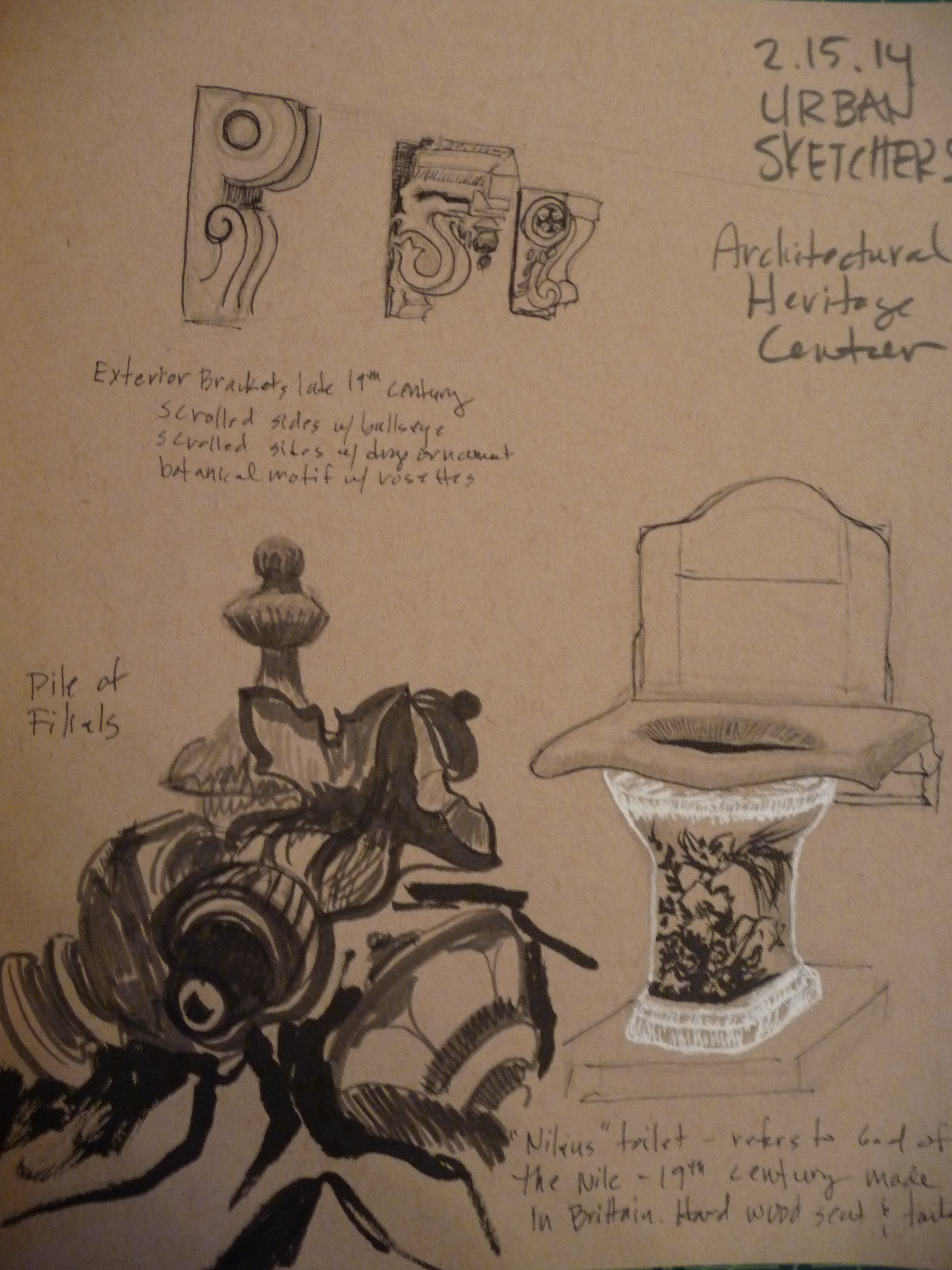The beautiful 19th century porcelain toilet, richly decorated with botanical motifs, drew many drawers to it. In fact, the voluminous representations of “Nilius” at the post-draw lunch made the Urban Sketchers group wonder if we should all post only our toilet drawings to our local blog page. We weren’t sure what enticed us the most: the luxurious experience of using an art toilet when plumbing was in its infancy, or the fact that every flush was a tribute to the god of the mighty Nile, as its model name testified. Regardless, the Architectural Heritage Center proved more than up to the task of sheltering our group from a fierce midwinter rain and wind storm on Saturday. My toilet is just OK, but better than the “Pile O’ Filials” that I tried to do in marker after seeing a compatriot do somethings similar at the Rebuilding Center last month.