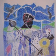 My morning obsession of the past week: The Sea God, 1977, from a compilation of Romare Bearden’s collage interpretations of Homer’s epic. The underlying grid and the bold shapes and colors scratch a deep itch in my brain. I actually was writing early morning letters two Saturdays ago and pulled out stamps I’ve had for some time – commemorative Romare Bearden stamps. I really looked at them. I pulled out my magnifying glass and really looked at them. I wondered what the four stamps looked like that I obviously favored – just a white empty track was down the middle of the series of four. Then I spontaneously got dressed and trained it downtown for a Central Library adventure day. I got two of his books, A Black Odyssey and The Caribbean Dimension. Above is a colored pencil study of Poseidon and I can’t think of a worse medium or paper to study the crisp energy of his collage work. But I think Circe is next.