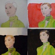 - Image 2: Hey, I watched a video on color theory, why not? (Note to self: video necessary, but insufficient.) In Sarah, 2002, there is a lot of red and my figure’s lips will also be scarlet lake eventually. I’ve only been exposed to underpainting in a continuing education oil painting class several years ago at PNCA, by Jerry Sumpter, who was wonderful. I’m an online-learning junkie and member of Lynda.c0m, and they’re getting more fine art tutorials. Mary Jane Begin’s are excellent. My hope is that the red will “vibrate” off of the green in some yet unknown way …