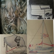 In Lieu of ever finishing a copy of Circe (1977 Romare Bearden) I’ve been doodling and sketching at lunchtime and during my morning routine. These are grouped together from the waterfront Blues festival and a post-work-decompression-doodle-session. The piano and boats are in my 3.5 x 5.5 Moleskine Pocket Storyboard Notebook – I thought the thumbnail boundaries would help me be speedier (nope). The doodle in white, gold, and black is on Strathmore 400 series Toned Tan paper – I love how fellow Urban Sketchers Vicki and Kalina work on the colored paper.