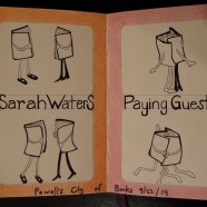 Monday at Powell’s, Lidia Yuknavitch interviewed Sarah Waters and could BARELY contain her passion for Waters’ new book The Paying Guests – it was entertaining! I got there about thirty minutes early and awkwardly sat in some very poorly arranged chairs that (practically by design) made it impossible to see the guests speak or read.  After it started, I was the first to bail and leave my “good” seat to stand in the back so I could see. It was worth it. I’ve seen Yuknavitch read at a Palahniuk event at the Bagdad and her short story kicked serious ass, but she was like a kid in a candy store trying to host a good interview without giving too much away. Waters smoothed the way a little by stating that if you’d read any of her books, you know that the characters tend to get “over-friendly,” which audience members responded to favorably. I feel awkward drawing in public, but penciled the notion as it came to me sitting there. It’s my 3rd or 4th attempt at cartoons. As I inked it in I felt it captured the gist of the evening.