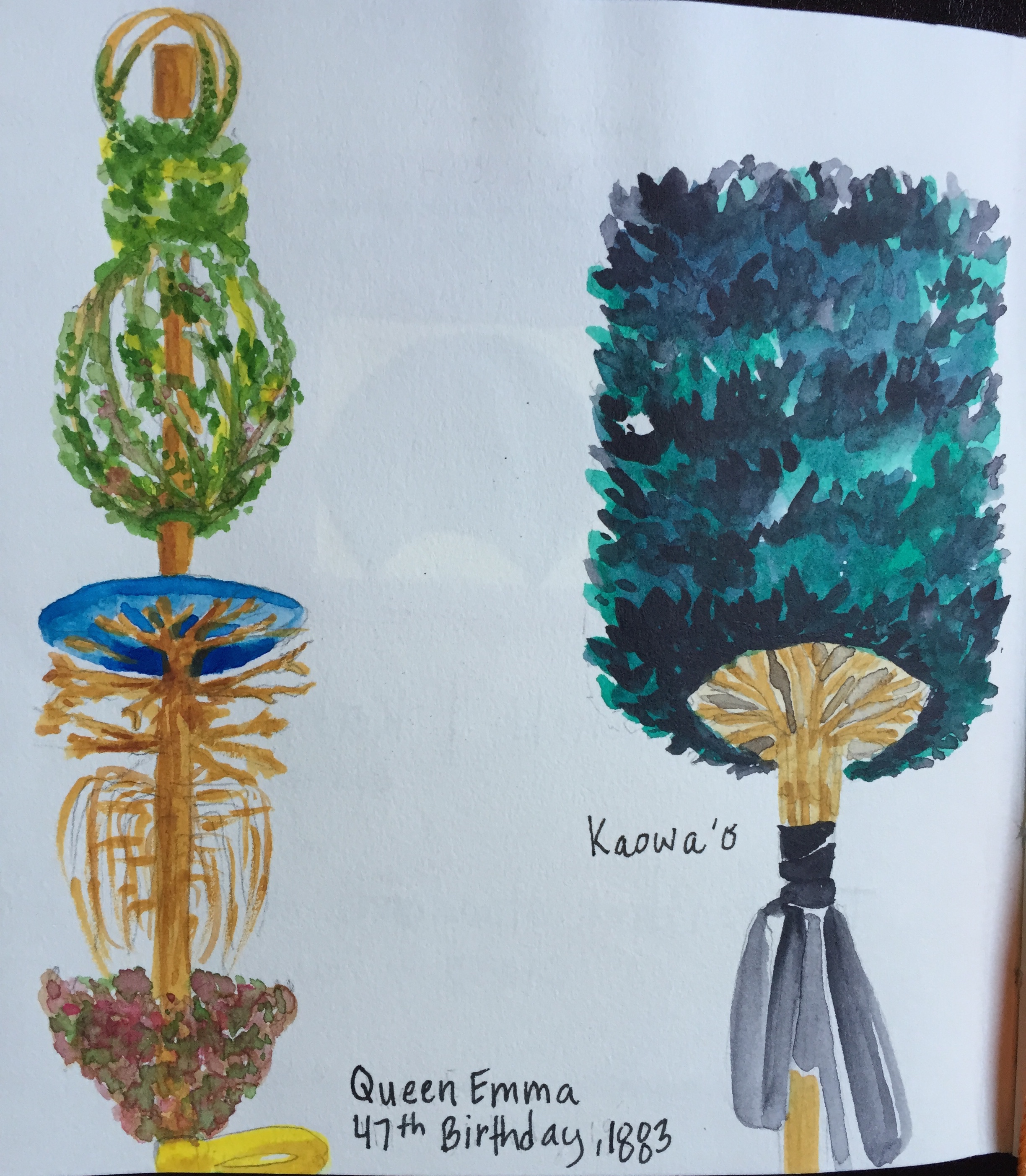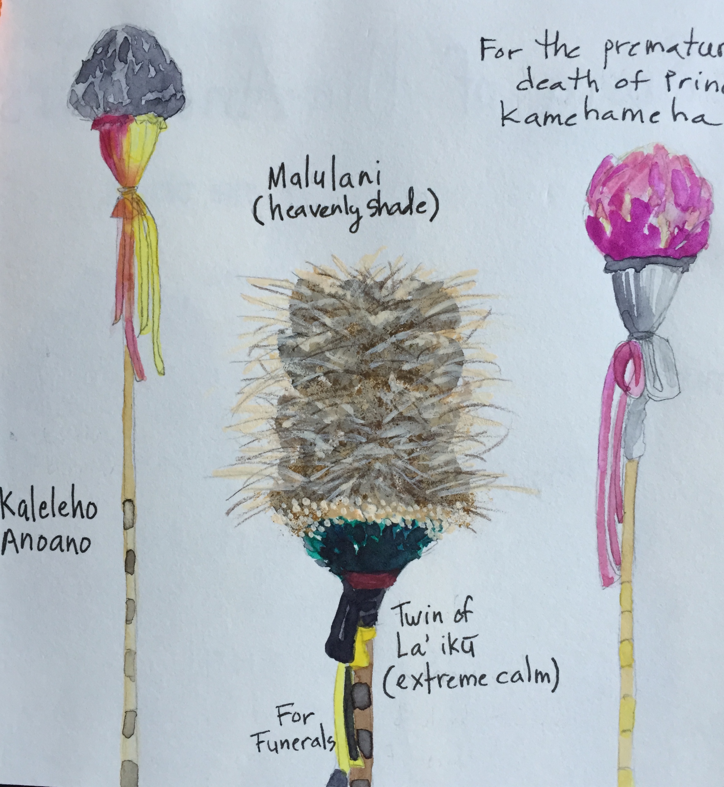 The Bishop Museum was a splendid gem: Victorian era construction meets modern Polynesian exhibits. These are Kahili – banners of chiefs akin to cloth standards emblazoned with house sigils, except wrought of exquisite feathers atop spears 15-20 feet tall. All of these belonged to Queen Emma.
