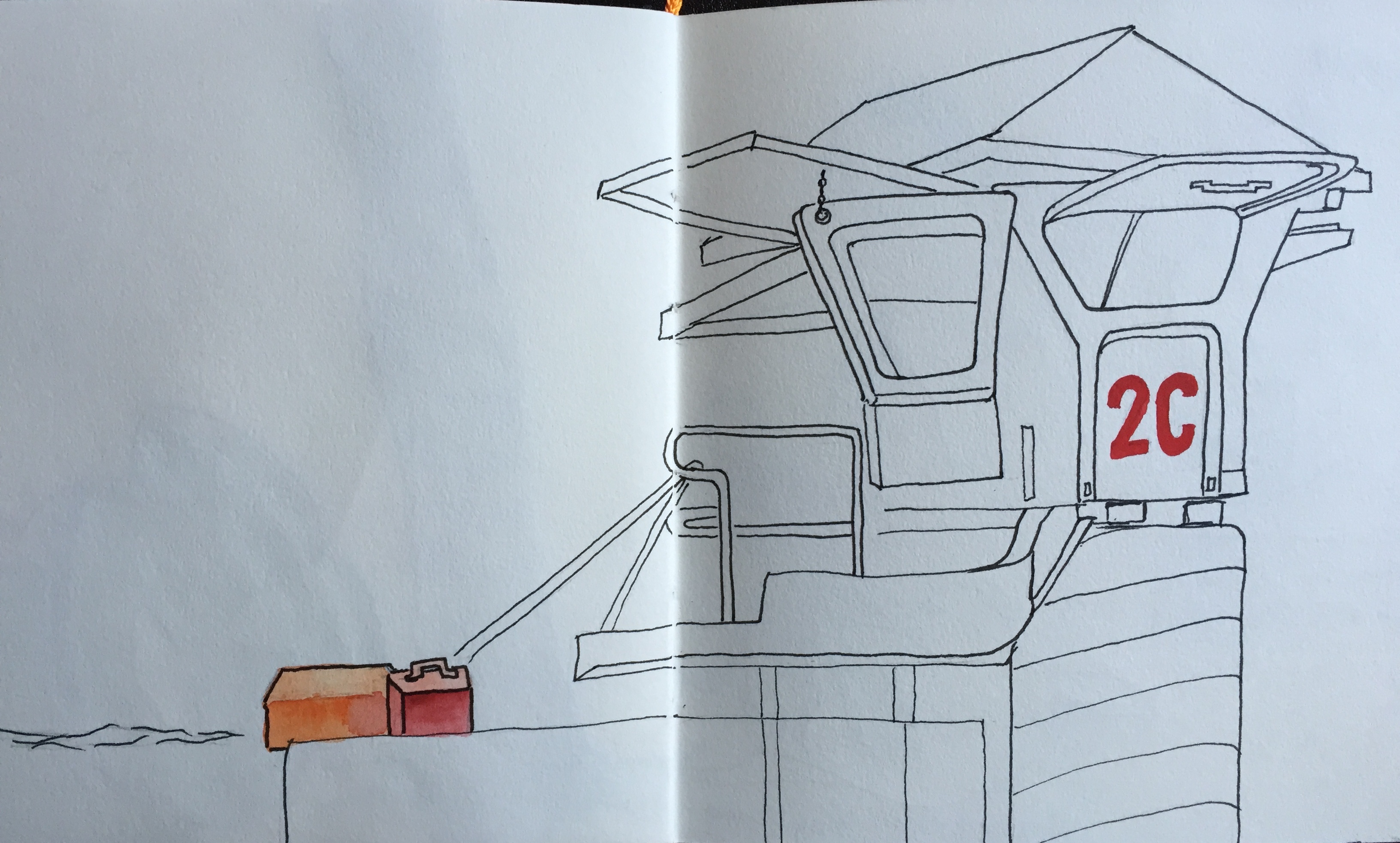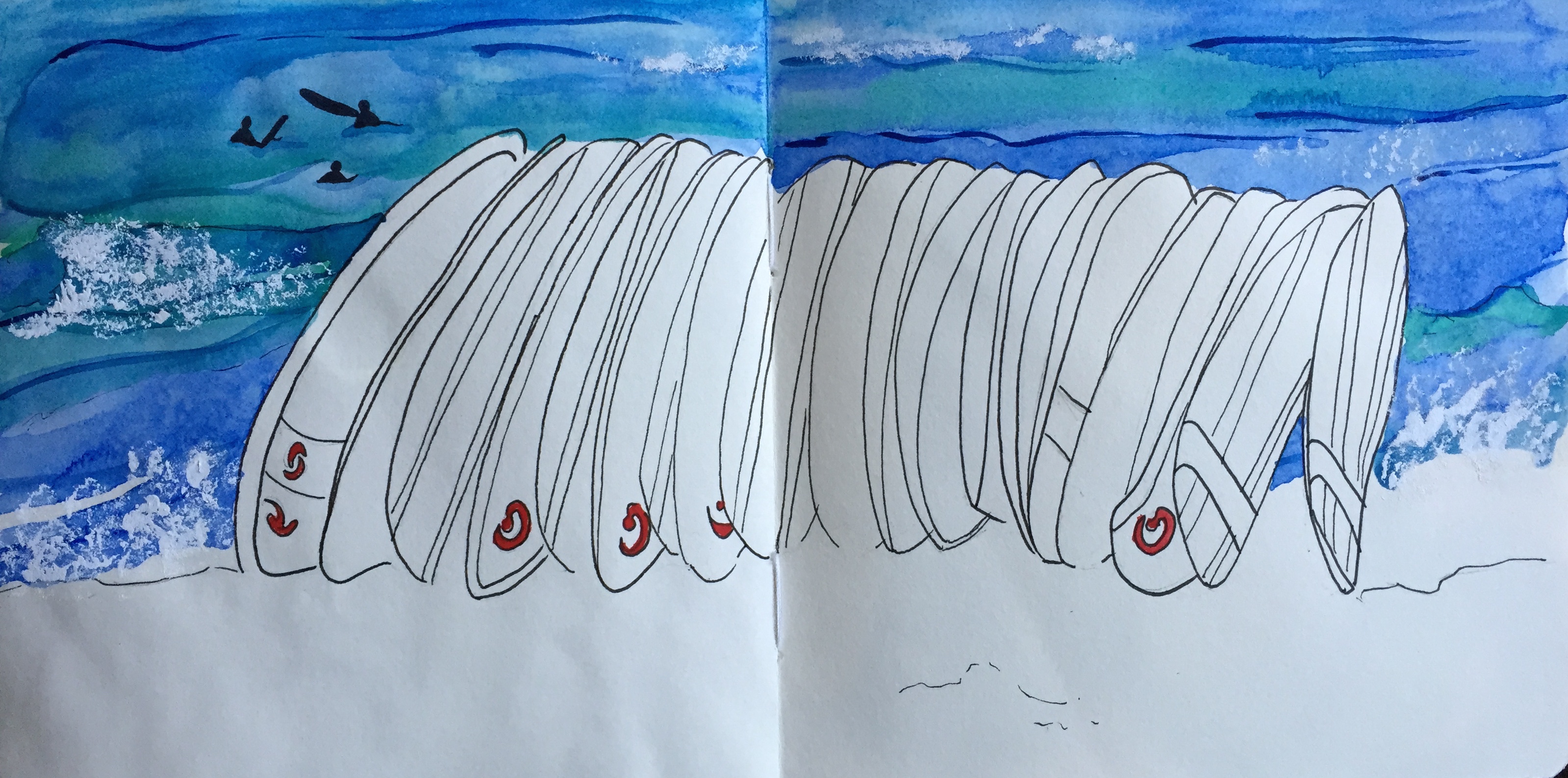 I colored the pool tubes in with my water brush pens at Starbucks: they have finally ditched Tazo tea in favor of Teavanna, and it was a welcoming vantage point if you’re staying in a hostel and are a morning person. The surfboards and lifeguard hut were a challenge for me: I avoid perspective and linear complexity, but set a time limit and feel happy with them. My next trip: faster, looser, and a higher volume of pages!