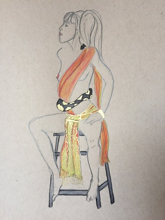 Because the snake around the figure model is real! This month’s Dr. Sketchy event featured another unique and lovely model (well, two, counting the snake), booze, prizes, and the great music and ambiance created by the organizers and the bar space itself. I also reconnected with three folks from Friday’s Drink-and-Draw, and my old housemate. A good time!