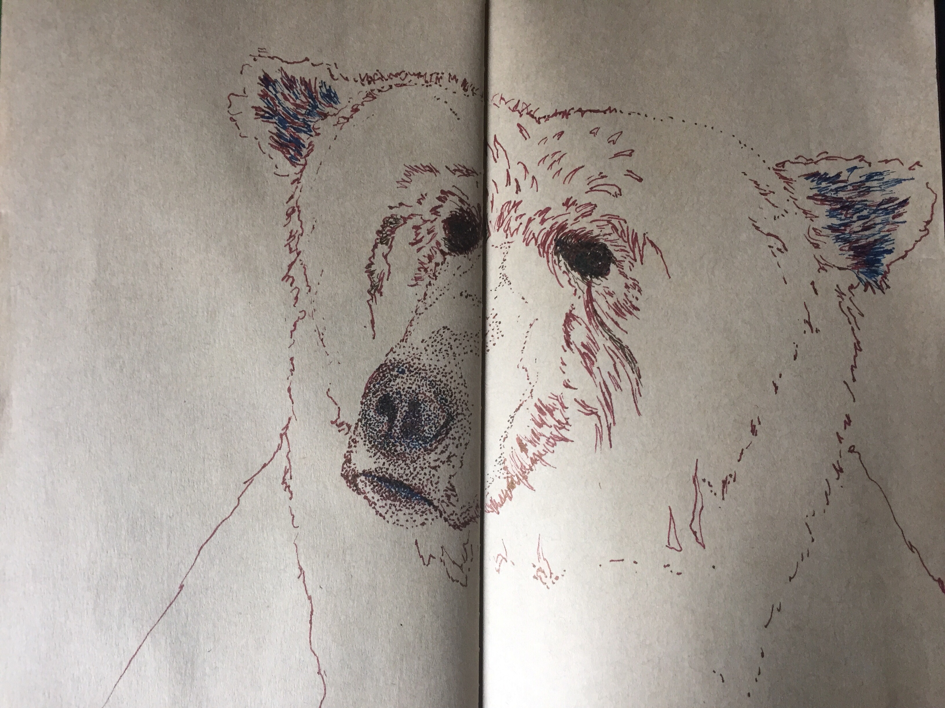 It was time to go home. I am not made to sleep upright. I envy people who can immediately power down anywhere, anytime, and for any duration. When I’m abandoned by such people on long-ish flights, audiobooks and doodling are the paths through sleep-deprived resentment. I would draw them, but somatic geniuses always want the window seats to lean into,and drawing clothed-shoulders is boring. So I picked a bear from the Alaska Airlines travel magazine and ordered some vino. The bear was so expressive. I intended to broaden his muzzle and maybe fill in some fur, but instead I triaged (somewhat) his left eye and am calling it good. Chicago, you were my summer highlight!