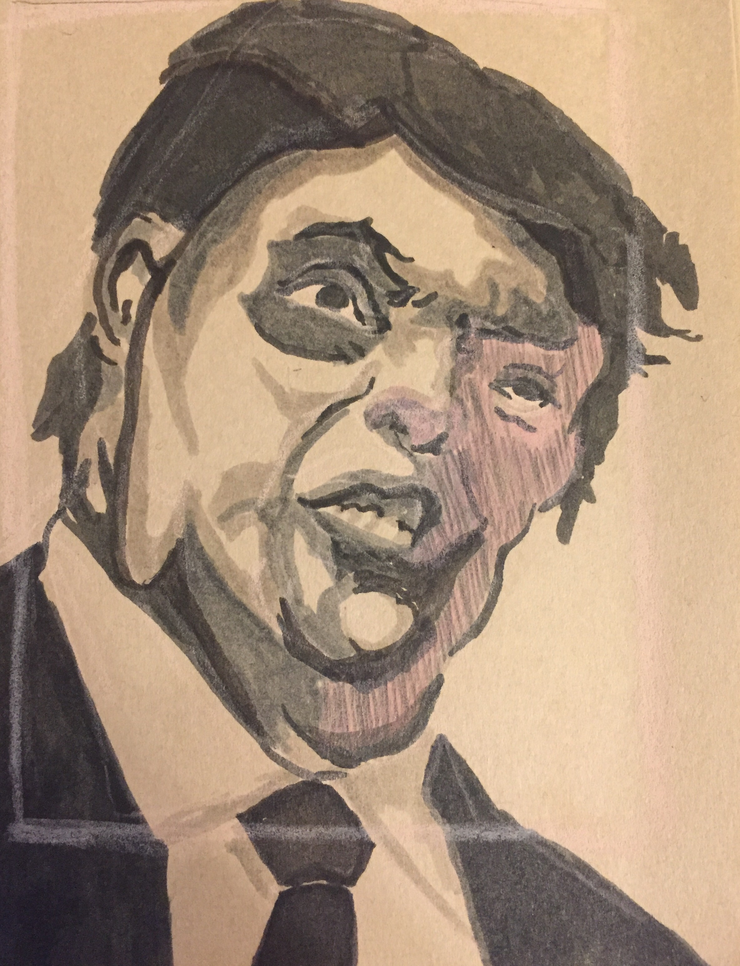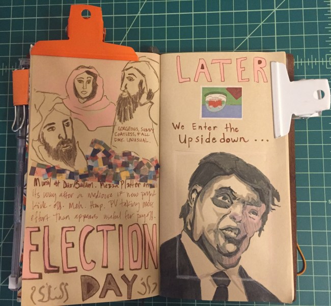 On my November 8th lunch hour I sat outside, coatless in the sun, and sketched some people in the mural at an Iraqi restaurant near work. November 9th, I began processing. Now, side by side in the aftermath, I hope they menace The Donald.