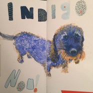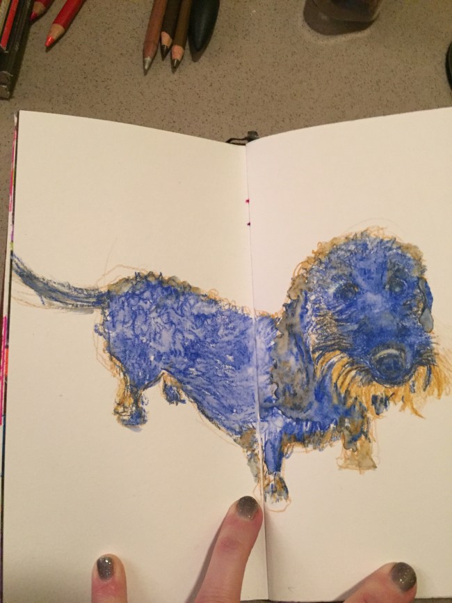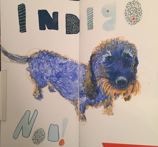 I added the lettering tonight and realized too late that the undiluted Dr. Martin’s would overpower the drawing. I backpeddled and balanced. I like how problem solving can land you with something you wouldn’t have thought to try. Although after I fine tuned it with colored pencils, Indigo still resembled the Wiener Dogs of the Na’vi. And his muzzle appears too narrowed.