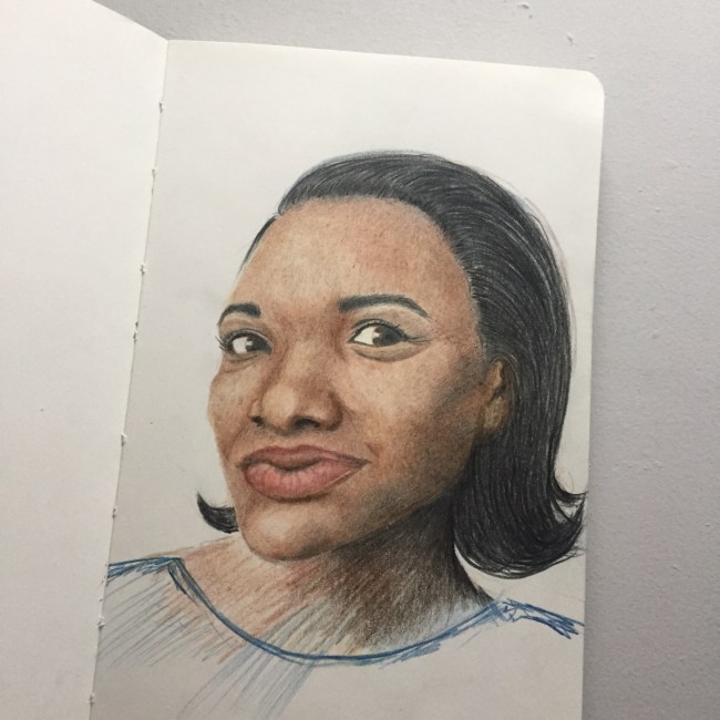 The angles on this drawing are off, creating a solid resemblance but not a true likeness, which takes a lot of time for me to achieve. I outlined and began shading in prismacolor colored pencils, which helps me loosen up from the start as I can’t erase fully. It felt good to sink into a lovely face on the plane, and at the hotel bar, and be reminded that your life is your own, and that you shouldn’t be complacent about living the best you can each day.